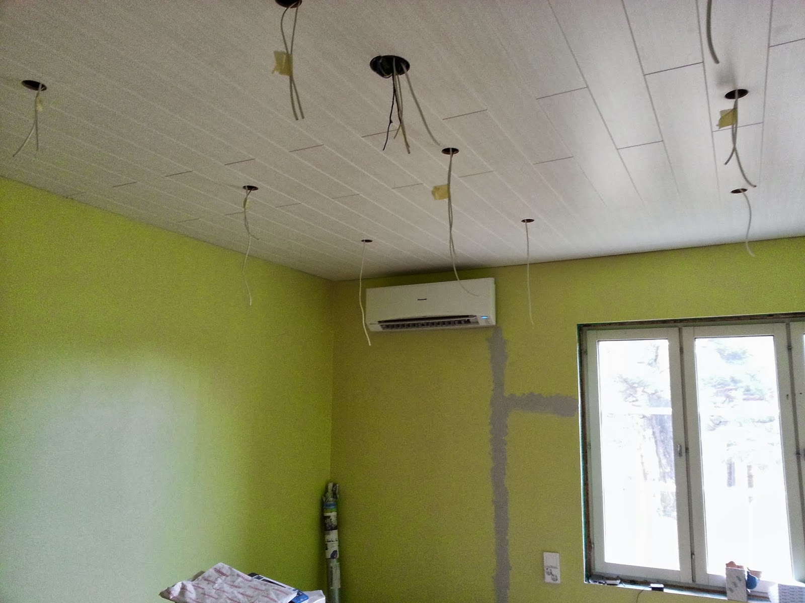 Mutta kyllä sitä jotain pientä on taas saatu aikaankin. On vaan niin paljon kaikkea mitä pitäisi samaan aikaan touhuta että menee välillä tosissaan puurot ja vellit sekaisin kun ei tiedä mitä pitäisi seuraavaksi alkaa touhuamaan. Alakerrassa on nyt olohuoneessa ja Jätkän huoneessa katto paneloitu. Keittiö ja eteinenkin on jo koolattu valmiiksi, eli ei muuta kuin paukuttamaan.